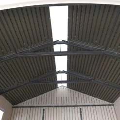- Steep angle allows for quick drainage of rain and snow, and provides a spacious walk-around interior, heavy-duty steel trusses increase strength