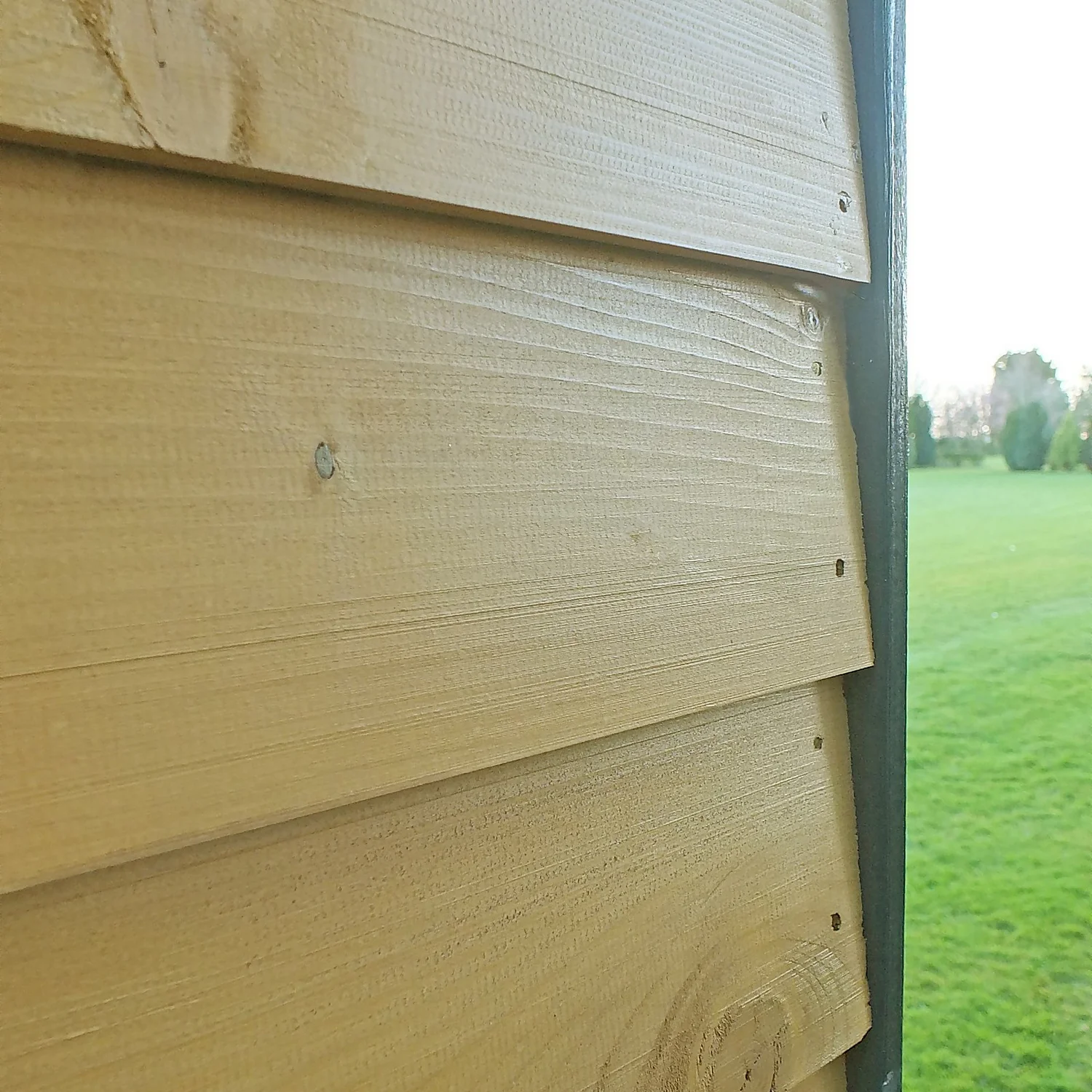 The building is constructed on strong 44 x 70 mm (2″ x 3″) square framing and clad with 20mm rebated bevel cladding overlap boards made only from the highest grade, slow grown, FSC approved, northern European pine. The roof is 12mm tongue and groove with mineral roof felt supplied to complete the exterior.