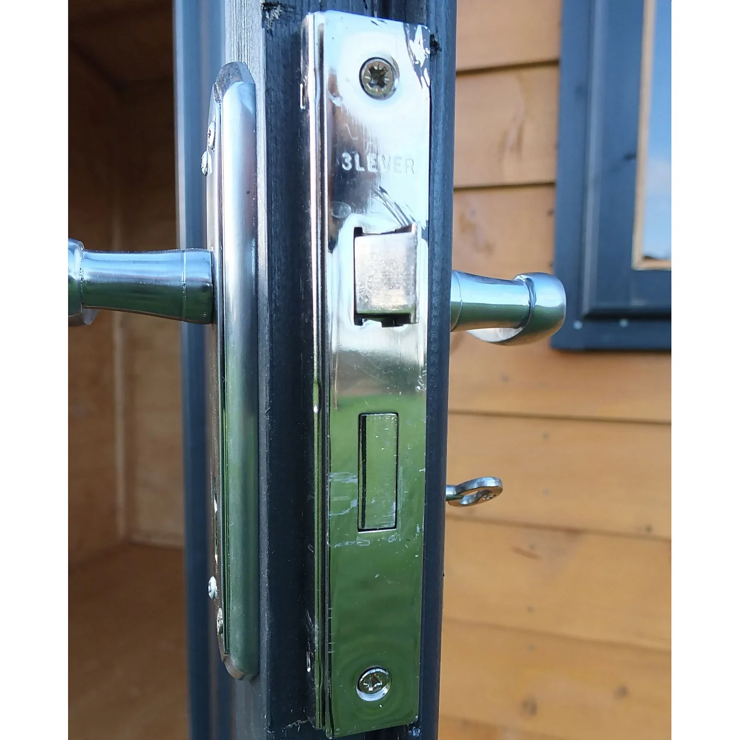 This modern garden studio updates the traditional summerhouse into a stylish garden room. The high quality, glazed double doors and two large opening windows provide lots of natural light, perfect for a work environment. The windows and doors are fitted with toughened, double glazed units. Windows and doors are also joinery made in a storm resistant design and the door is fitted with a mortice lock.