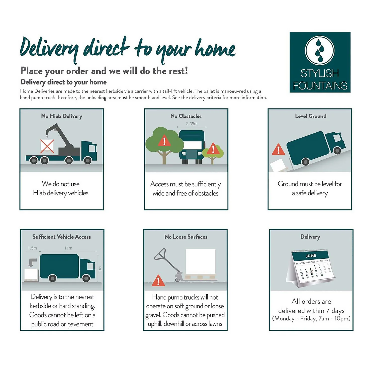 Water tumbles and bustles its way down this stretched flume feature. The extended path of the water sound builds an incredibly relaxing setting. It has a bridge style formation allowing the feature to span across obstacles or also to be filled in with green life to blend the sides in with the surrounding area. The path of the water illuminated by integrated LED lights, so it can be enjoyed throughout the day. This stylish fountain will enrich any area of your indoor or outdoor space. All you need is included, just install and enjoy.